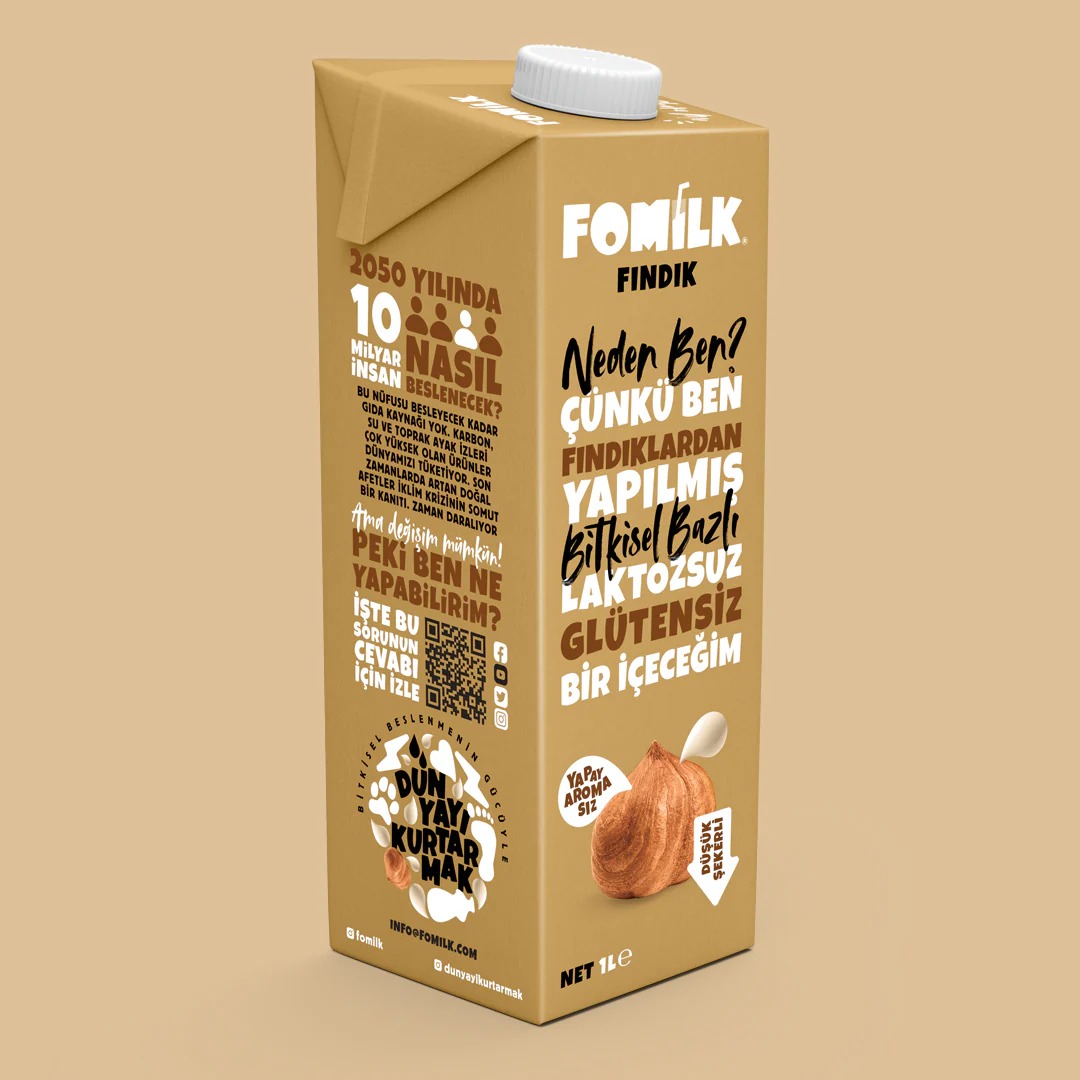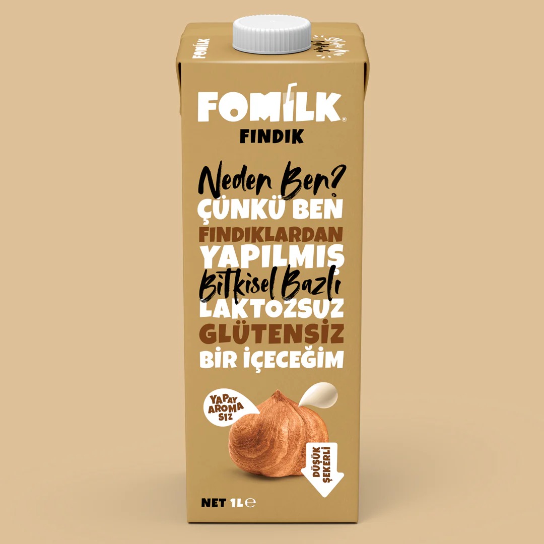 Türkiye’nin ilk yerli üretim bitkisel bazlı içeceği benim! Yapay aroma ve koruyucu içermiyorum. Kavrulmuş fındıklardan yapıldım; doğal olarak glütensiz ve laktozsuzum. Tek başıma tadımı çıkar veya beni kahvene kat; kahvaltıda, yemeklerde, içeceklerde veya gönlün nerede isterse kullan. Uzun ömürlü olmamın sebebi ultra-ısıtılmam ve beni dış dünyadan çok iyi koruyan doğa dostu kutum! *Aldığın her Fomilk ürünü ile yardıma muhtaç hayvanlara destek oluyorsun. Dünya nüfusu 2050 yılında 10 milyar insana çıkacak. Bu nüfusun nasıl besleneceği ise soru işareti olmaya devam ediyor. Bu kadar insanı besleyecek gıdanın olmadığını biliyoruz. Karbon, toprak ve su ayak izi yüksek olan gıda ürünleriyle yeni nüfusu beslemek sürdürülebilir değil. Türkiye’deki fındık üretimi için gereken suyun çok önemli bir kısmı yağmur sularıyla doğal olarak karşılanıyor! Günümüzde dünyada bitkisel bazlı beslenmenin faydaları sadece vejetaryen ve vegan beslenen kesimler ile laktoz ve glüten hassasiyeti olanlar tarafından değil, bilinçli ebeveynler, sporcular ve sağlıklı beslenmeye dikkat edenler başta olmak üzere geniş kitleler tarafından bilinmeye ve benimsenmeye başladı. Fomilk, tüketilen geleneksel ürünlere alternatif olarak, bitkisel bazlı, besin değeri yüksek ve lezzetli ürünler geliştiriyor. -Yapay aroma içermez. - Koruyucu içermez. -Glüten içermez. -Kimyasal köpürtücü içermez. -Doğal olarak laktozsuz. -Süt ürünü içermez. (Bitkisel bazlı)