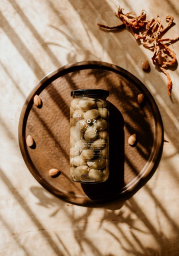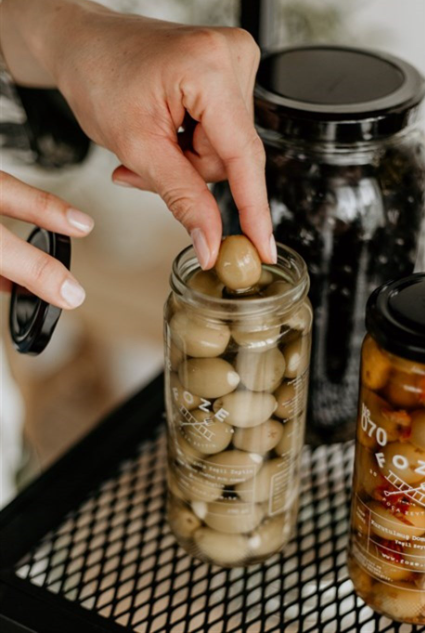 Gurme serisinden olan ve Foze'nin imza lezzetlerinde bir tanesi olan Badem Dolgulu Yeşil Zeytin domat cinsi çekirdeksiz zeytinlerin içine soyulmuş iç badem doldurulmasıyla üretilir.