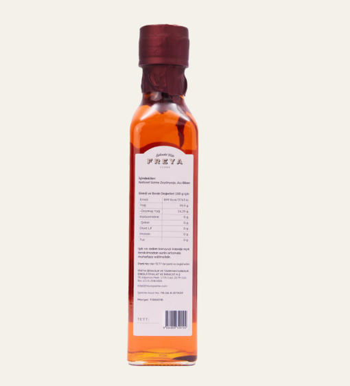 İçindekiler: Soğuk sıkım zeytinyağı, acı biber
