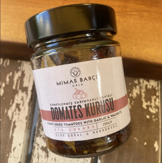 Mimas Bahçe Confi Sarımsaklı Kuru Domates Sosumuzu hazırlarken kendi kuruttuğumuz ata tohumu kuru domateslerimizi kullanıyoruz. Confi Taş Köprü Sarımsağı, Tane Karabiber ve Defne Yaprakları ile lezzetlendirdiğimiz sosumuzu ceviz içi ekleyerek sizlerin beğenisine sunuyoruz.
