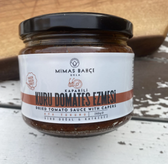 Mimas Bahçe Kuru Domates ezmemizi kapari,fesleğen,kekik,sarımsak,ceviz,soğuk sıkım zeytinyağı ile hazırladık.