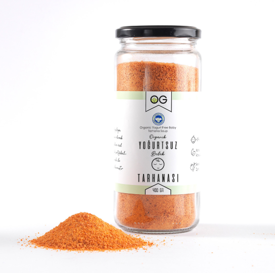 Bebeklere özel organik sertifikalı temiz içerikler ile sütsüz ve yoğurtsuz olarak hazırlanmış organik yoğurtsuz bebek tarhanası.