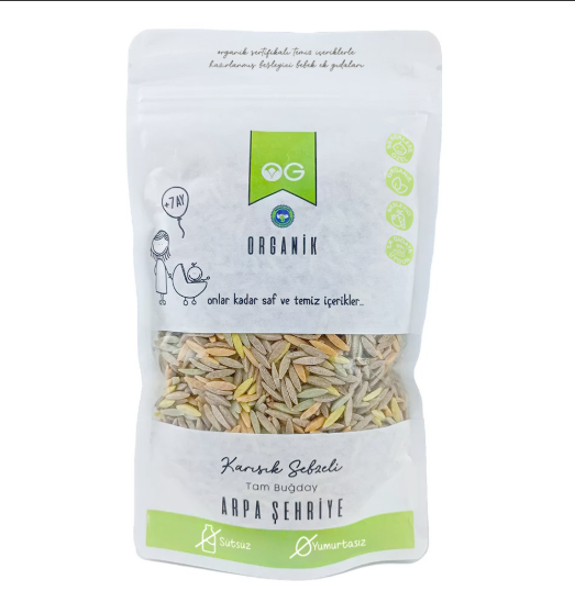 İçindekiler: Organik sebze püresi (%15) (organik balkabağı püresi, organik kırmızı pancar püresi, organik zerdeçal, organik ıspanak püresi, organik kapya biber püresi), organik durum buğdayı unu (%70,83), organik tam buğday unu.