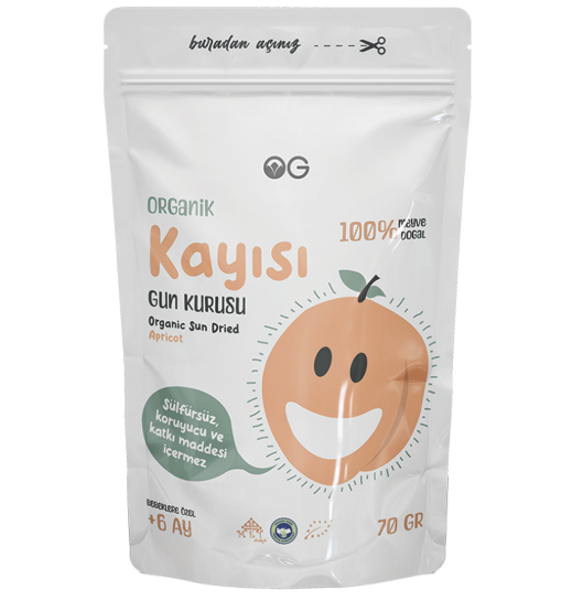 Organik Kayısı kurusu organik tarım ile Pestisit kalıntısız sertifikalı üretildi. +6 aydan itibaren bebek ek gıdalarında kullanılabilir.Bebeğiniz için en iyi gıda anne sütüdür ve ek gıdalar sadece anne sütünü tamamlayıcıdır. Bu ürün ilgili Sağlık profesyonelerinin tavsiyesi ile kullanılmalıdır